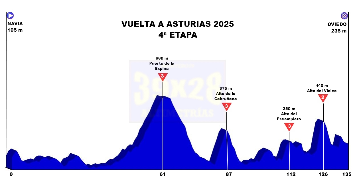 ETAPA 4: La cuarta y última etapa de la Vuelta a Asturias 2025 enlazará el occidente asturiano (Navia, más en concreto en la sede de Industrias Lácteas Asturianas en Anleo) con la capital de Asturias, Oviedo, en una jornada de tan solo 135 kilómetros, pero con una sensible dureza global: se suben los puertos de la Espina, Cabruñana y Violeo antes de la meta situada en la Calle Uría. El desnivel acumulado de esta cuarta etapa llega a los 2500 metros.