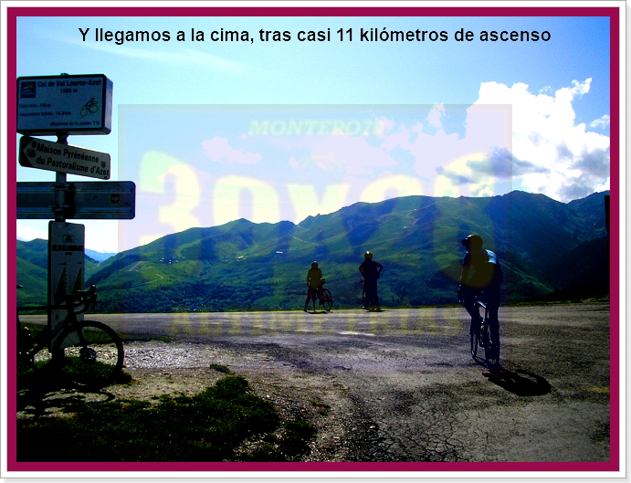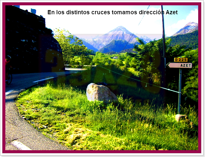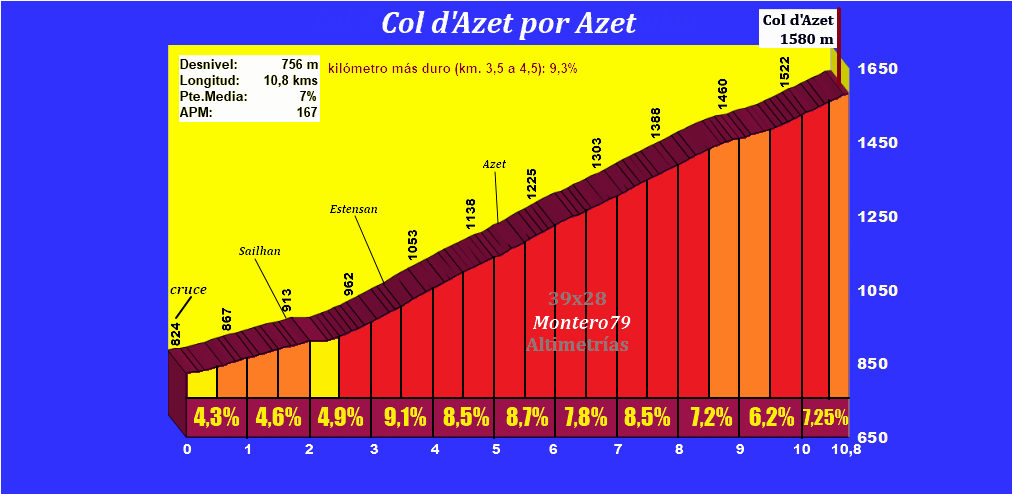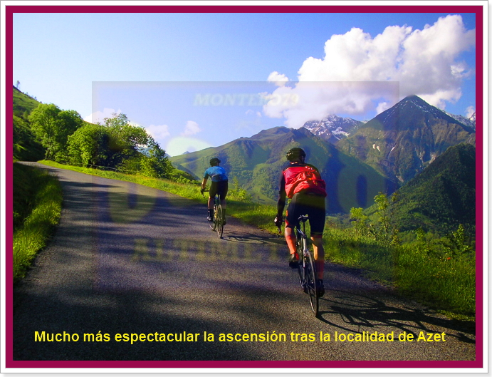 Tras un último tercio algo más suave, Azet se corona cuando llevamos 10,8 kilómetros, a una altitud d 1580 metros, y es un puerto ideal para enlazar con Peyragudes, Peyresourde o Aspin, si bien esta vertiente habitualmente (en subida) es menos utilizada, pues la opuesta se ha incluido de camino a Pla D'Adet, al col de Portet o a Piau Engaly. Así, por esta cara de Azet se subió en el Tour de 1997, año que se estrenó de paso: