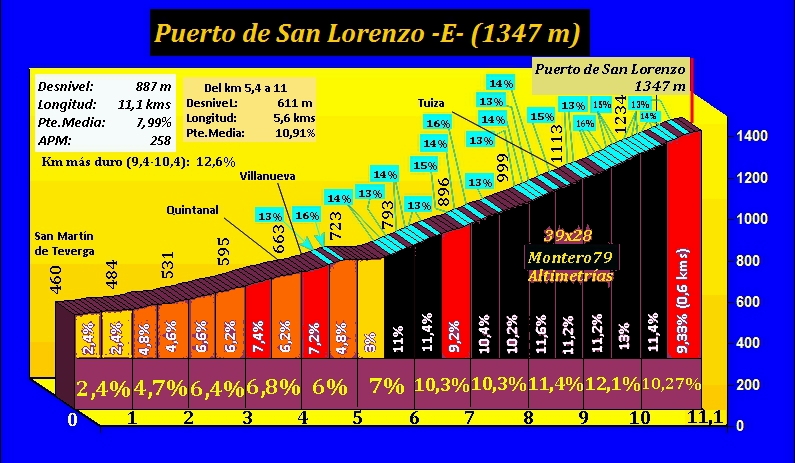 San Lorenzo por Teverga es una dura subida de once kilómetros con una pendiente media del 8%, destacando, sobre todo, sus rampas a partir de Villanueva, con un espectacular tramo de 5,4 kilómetros al 10,9%...