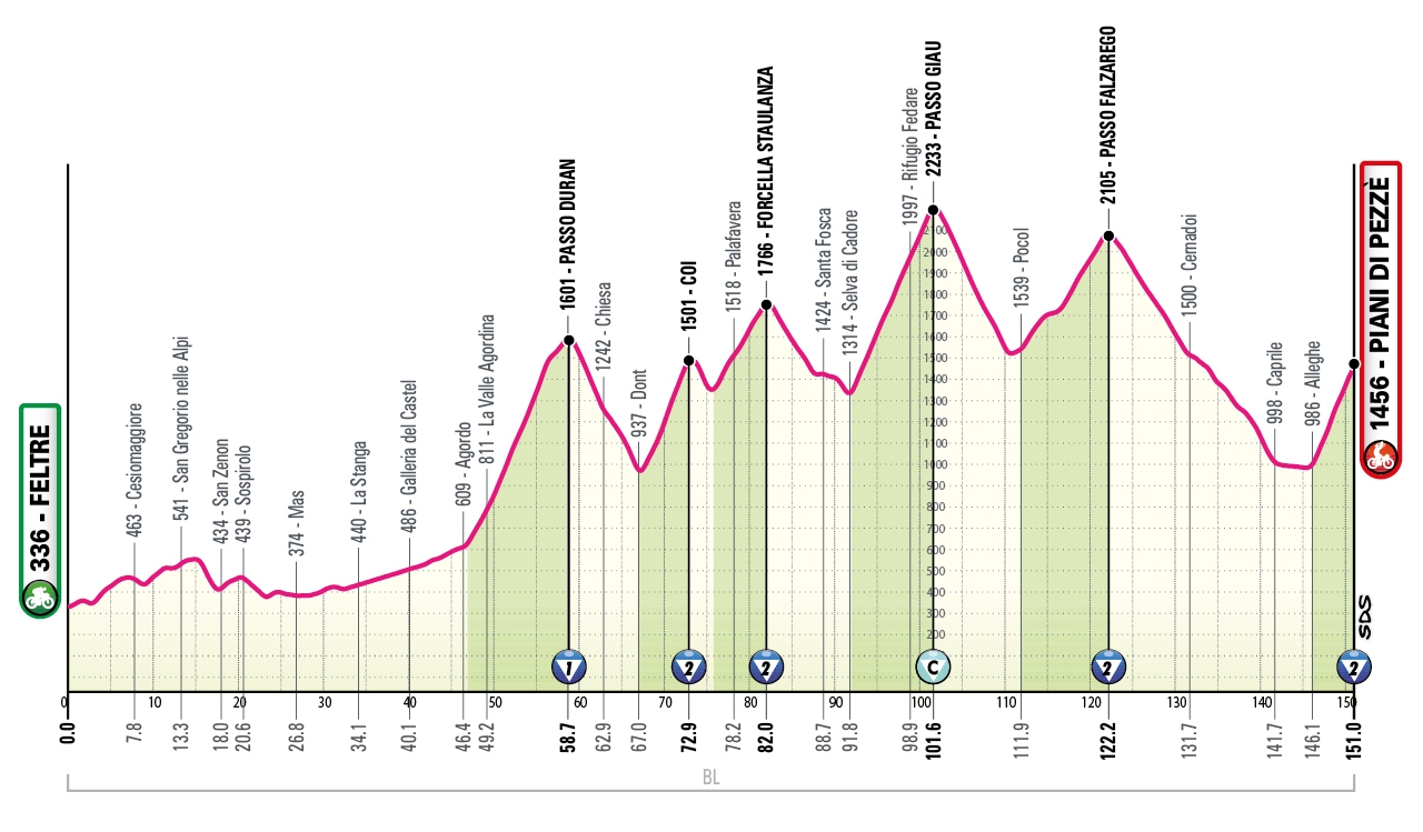 | 2019 | Feltre-Monte Avena | 5400 m | 194 kms | 20 | Cima Campo, Manghen, Rolle, Croce D’Aune, Monte Avena |
