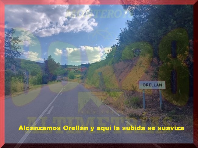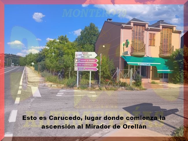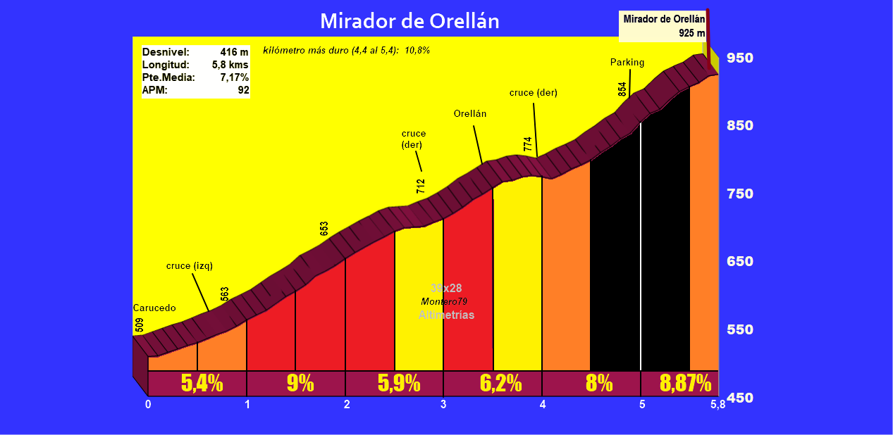 La ascensión al Mirador de Orellán arranca de la localidad de Carucedo, pueblo situado sobre la carretera nacional N-536, y en donde tomamos el desvío a Orellán y las Médulas. Ya en plena subida, en el primer kilómetro, giramos a la izquierda por la carrretera que se dirige a Orellán (atentos, no al pueblo de las Médulas). Será aquí donde se desarrolle el primer tramo de especial dureza de la subida, con rampas en torno al 10-11% hasta llegar a un nuevo cruce: con la carretera que proviene de Borrenes, previo a la llegada a Orellán, en donde habrá un leve descansillo. La carretera se estrecha al paso por esta localidad, de la que saldremos con un tremendo rampón tras una nueva bifurcación que abre la parte final y más dura de la subida, la que nos lleva definitivamente al Mirador de Orellán. Rampas aquí de dos dígitos y paisaje bastante abierto que desemboca, en principio, en el parking del Mirador y, más adelante, en el propio Mirador, tras otro rampón de órdago.