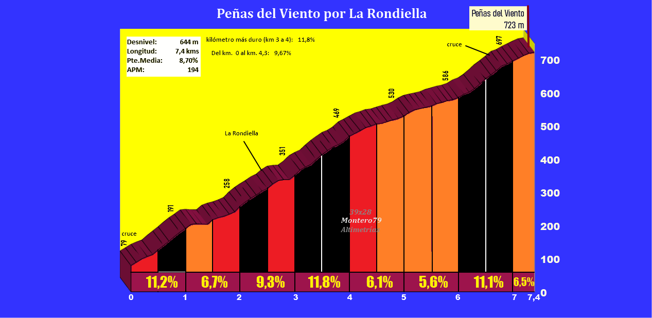 Tras un tramo de casi dos kilómetros, y poco antes de encontrar el desvío a Gallinero (otra vertiente que sube por el norte) las rampas vuelven a incrementarse, aunque la dureza se hace menor al disfrutar de unas vistas increibles sobre la costa asturiana. Peñas del Viento por La Rondiella se corona a 723 metros de altitud, tras un recorrido de 7,4 kilómetros a una pendiente media del 8,7% (muy engañosa vistos los numerosos descansillos).