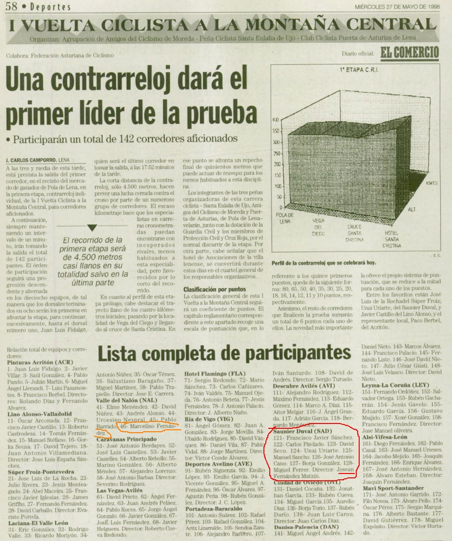 Aquí a la izquierda tenéis la única imagen que aún se conserva de la mítica contrarreloj con la que se abría la Vuelta a la Montaña Central de 1998, y en la que hice un destacadísimo puesto 98, y todo a pesar de no dormir apenas la noche anterior, de estudiar, de tener catarro, de contraer numerosos virus, de no tocar la bici en los días anteriores, de jugar a fútbol durante 5 días consecutivos, de echar novia, de no salir de las pastelerías de la Pola en la semana anterior y de cuantas excusas a usted se le pasen por la imaginación en estos mismos momentos.