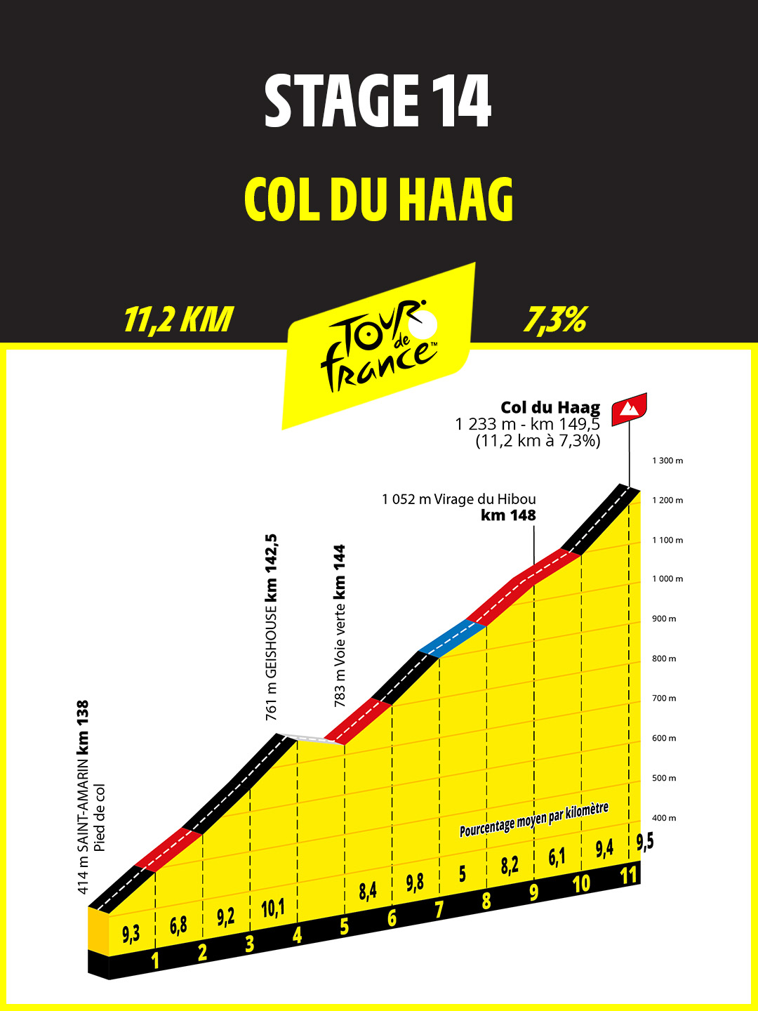 ETAPA 14: Todo "un serrucho", similar al del "fin de fiesta" del Tour 2023, donde también se finalizó en Le Markstein. Cinco puertos en esta dura jornada de casi 4000 metros de desnivel en tan solo 155 kilómetros. Se pasan los habituales Balón de Alsacia y el Grand Ballon, además de estrenarse el duro Haag (perfil sobre estas líneas).