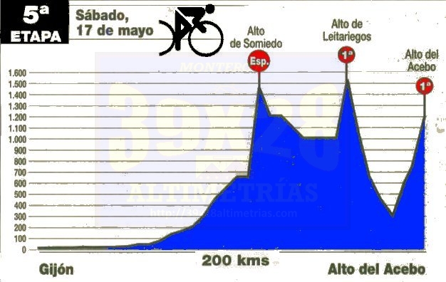 ETAPA 5: Etapa reina, sin duda, por distancia, categoría de los puertos, desnivel. Se pasan Somiedo, Leitariegos y Santuario del Acebo.