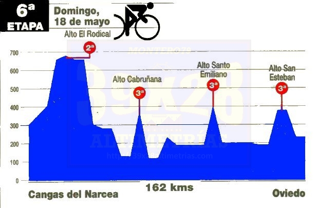 ETAPA 6: Etapa final bastante quebrada entre Cangas del Narcea y Oviedo. Se pasan El Rodical, la Cabruñana, Santo Emiliano y San Esteban.