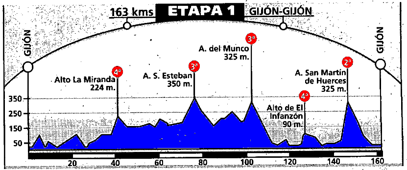 ETAPA 1: La Vueltina empieza con una etapa quebrada camino de Gijón. Se suben La Miranda, San Esteban, Muncó, Infanzón y San Martín de Huerces.
