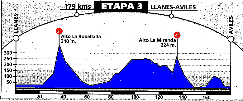 ETAPA 3: Etapa más para sprinters la del final en Avilés y en donde se pasan Robellada y La Miranda.