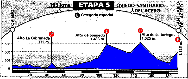 ETAPA 5: Etapa reina, sin duda, por distancia, categoría de los puertos, desnivel. Se pasan Cabruñana, Somiedo, Leitariegos y Santuario del Acebo.