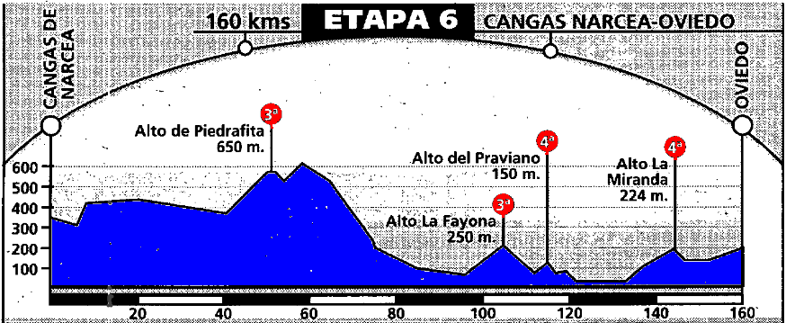 ETAPA 6: Etapa final bastante quebrada entre Cangas del Narcea y Oviedo. Se pasan Piedrafita, Fayona, Praviano y, nuevamente, la Miranda.