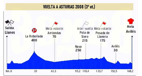ETAPA 3: La tercera etapa sale de Llanes, asciende el alto de la Robellada y llega a Avilés tras 168 kilómetros.