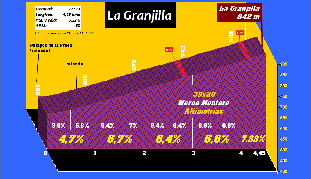 La Granjilla finaliza tras 4,45 kilómetros en una zona más abierta, no habiendo cartel propiamente dicho de la ascensión. La subida es ideal para culminar, en la competición, una etapa o carrera en San Martín de Valdeiglesias, por ejemplo...