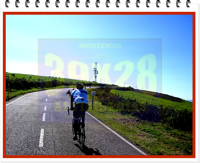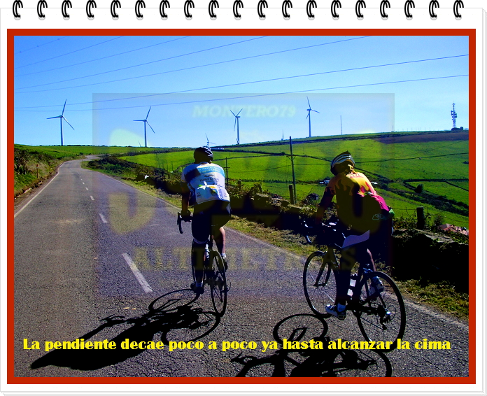 Alcanzamos Ayones cuando llevamos poco más de 5 kilómetros, continuando por la carretera autonómica por la que transitábamos y dejando la que a Los Corros (la que en mente teníamos como vertiente más dura...). Rampón al 14% y, a la salida de Ayones, que nos encontramos con un desvío, a la izquierda sin indicaciones. Tomamos esa carretera que durante dos kilómetros incrementará la dureza notablemente... Se suceden ahora los rampones, aunque no muy bruscos (la máxima llega al 18%), siendo destacable la regularidad del tramo, muy abierto, por cierto (ojo, que en verano puede convertirse en un infierno de ascenso). Un kilómetro entero a más de un 13% por una carretera impecable que coronaremos antes de salir al cruce con la que proviene de Los Corros. Viene ahora un corto tramo de bajada, antes de acometer más rampas duras y alcanzar otro cruce más: el de la carretera autonómica que habíamos dejado antes. Desde ahí, poco más de dos kilómetros de cierta dureza pero que irán perdiendo intensidad a medida que nos aproximemos a la cima. Eso sí, con el desgaste anterior y el fuerte viento que sopla en esta zona (estamos en un parque eólico), las dificultades se incrementan.