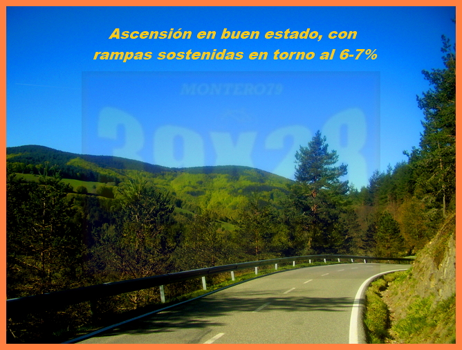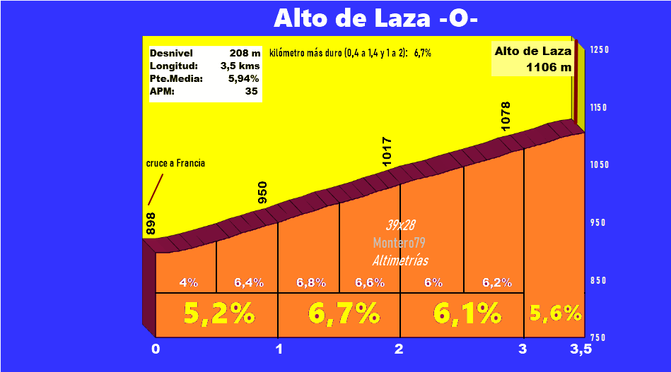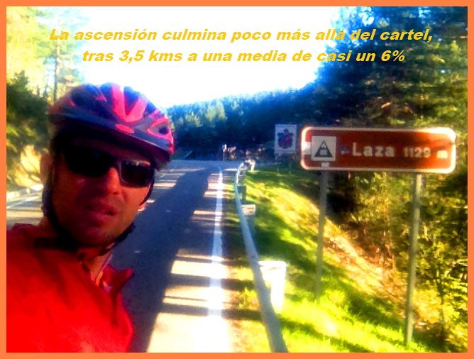 Subida que cuenta con algo más de 3 kilómetros a una media en torno al 6% y sin rampas dignas de mención, que transcurre, casi siempre por un frondoso bosque, y por una carretera en bastante buen estado (sin arcén, eso sí). Esta subida a Laza, desde el desvío a Francia (se puede remontar el valle desde Ochagavía, ganando leve desnivel) no atraviesa localidades y se corona a 1106 metros de altitud.
