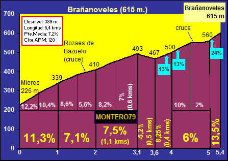 Una de las más espectaculares ascensiones que se sitúan en el concejo de Mieres es ésta de Brañanoveles. Arranca en el desvío que nos encontramos en la carretera As-242, hacia Vegalafonte. Es, por tanto, coincidente la primera parte con la ascensión a Rozamayor y el alto de Cueña. Un demoledor tramo, el inicial, hasta Rozaes de Bazuelo, con zonas por encima del 10% de pendiente que transcurren por un asfalto en excelente estado (incomprensible su nula utilización en las distintas rondas que se disputan por la zona, teniendo en cuenta que se podría utilizar como puerto de paso). Y llegados a dicho pueblo nos encontramos un leve descanso, tras el cruce a Brañanoveles y Tablao, que nos servirá para recargar energías y afrontar la segunda parte, de algo más de un kilómetro con rampas que oscilan entre el 7 y el 9%. Culmina el mismo en una especie de altillo donde se sitúa el desvío hacia la localidad de El Carboneru. Posteriormente un tramo de descenso de medio kilómetro da paso a la última parte de la ascensión, la más dura, con varias curvas de herradura y rampas que llegan al 13%. Es el aperitivo de lo que nos espera tras sobrepasar la bifurcación de la carretera (tomando nosotros sentido Brañanoveles), en donde la fisonomía de la carretera cambia por completo, puesto que se estrecha y el estado del asfalto, hasta entonces perfecto, se transforma en irregular, aunque aceptable. En las mismas caleyas de Brañanoveles tras superar una nueva curva de herradura (ver foto) arrancan los 400 metros más demoledores de toda la subida con pendientes que llegan al 24% y que culminan en una pequeña explanada desde la cual tenemos una amplia visión de buena parte de la comarca del Caudal, del Aramo, las Ubiñas,…