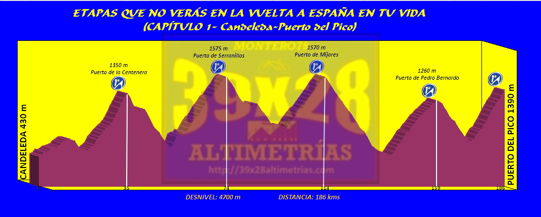 Una etapa hipotética en la sierra de Gredos, con clásicos de la zona que, como veis, enlazan de lujo, prácticamente sin llano. Se pasan los puertos de la Centenera, Serranillos, Mijares, Pedro Bernardo y, para finalizar, El Pico. El recorrido se va a los 4700 metros de desnivel en 186 kilómetros.
