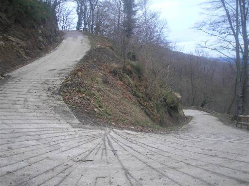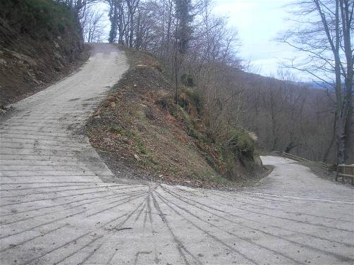 Kilómetro 2,2 de ascensión. Todo lo que hemos visto hasta ahora nos habrá provocado dudas acerca de los datos proporcionados, pero entramos en nueva dimensión. Seiscientos metros cuya pendiente media se sitúa en el 17,33%, muros al 20% y un hormigón rayado que dificulta el pedaleo. Casi 3 kilómetros de subida, cuando volvemos a encontrarnos otra fase de descanso, más breve que las anteriores y que nos adentra de lleno en el bosque, transcurriendo así los siguientes 3 kilómetros aproximadamente. La subida ahora ya no nos va a proporcionar referencias, puesto que se sucederán las curvas de herradura, en hormigón y larguísimos tramos rectos cuya pendiente transcurre casi siempre por encima del 15%. Y no tendremos referencias hasta que en el kilómetro 5,5, aproximadamente, la carretera se abre completamente y abandonamos la zona arbolada. Si todo lo anterior nos ha dejado ya completamente agotados, ya que las pendientes se han mantenido por encima del 10% durante más de 3 kilómetros, lo que viene ahora nos va a producir una sensación de desasosiego y miedo, ya que las rampas se incrementan aún más y vemos, muy al fondo, Carraceo y la pista de la Carisa. El tramo, en hormigón, es absolutamente infernal. Una recta cuya inclinación se va incrementando más y más...
