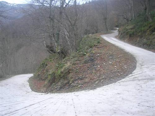¿Y esta subida es de bici de carretera o de BTT? Aquí hay dudas, amplias dudas. Los dos primeros kilómetros son de asfalto, hasta que llegamos al desvío hacia Carraceo y dejamos a un lado la carretera que va a los Bustios. Arranca aquí un tramo de unos 200 metros de zahorra, aunque compactada, con lo que bien se podría hacer en bici de carretera. A continuación viene el brutal tramo de 600 metros cuya media supera el 17% y que transcurre por hormigón. Posteriormente, hasta el kilómetro 5,5, aproximadamente, se suceden los tramos de tierra, compactada, y hormigón (no solo en las curvas de herradura, como se verá en las imágenes). La última fase de la parte dura, hasta el kilómetro 6,9 (es decir, casi kilómetro y medio) es de hormigón (salvo unos 100-200 metros). El descenso hasta las cabañas ganaderas de Carraceo vuelve a ser de tierra, y luego hay varias zonas de hormigón hasta el final de la subida... Cuestión de gustos, aunque más recomendable hacerla con BTT, pero repito el estado de la pista es comparable a los transitados Finestre (en el Giro de Italia) y Trobaniello (uno de los futuribles puertos de tierra de la Vuelta a España). Sólo hay que ver las fotos para hacerse una idea...