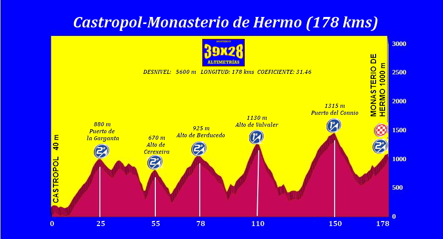 Etapa que se desarrolla por el Occidente asturiano, con el duro puerto de la Garganta al principio. Posteriormente el Palo, pero hasta Berducedo, donde buscaremos la carretera del Pozo de las Mujeres Muertas por Valledor. Y para rematar la jornada el larguisimo Connio y la desconocida subida al Monasterio de Hermo...