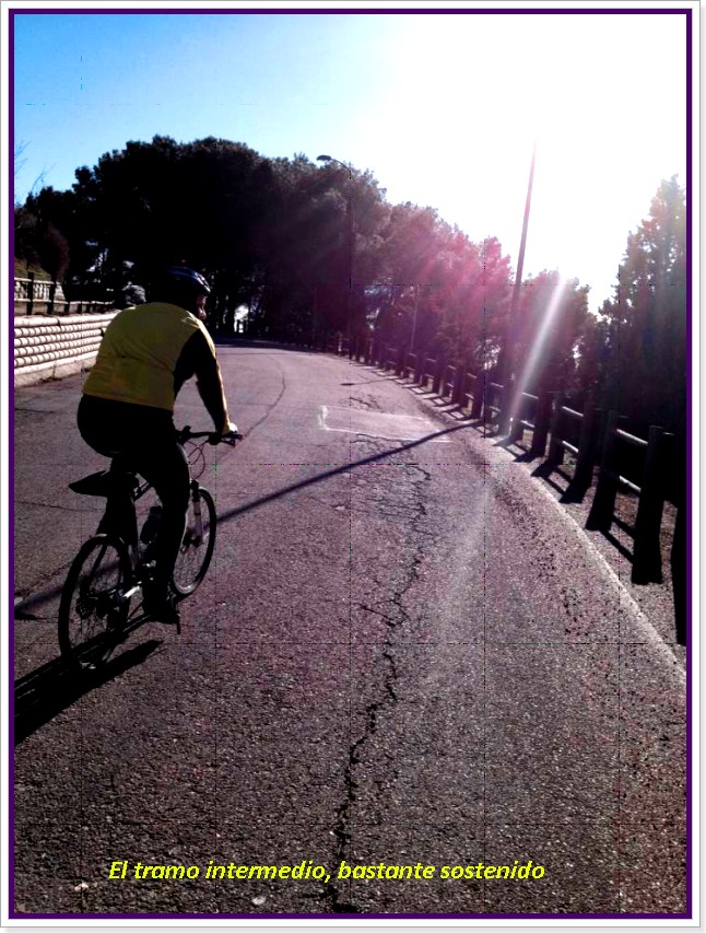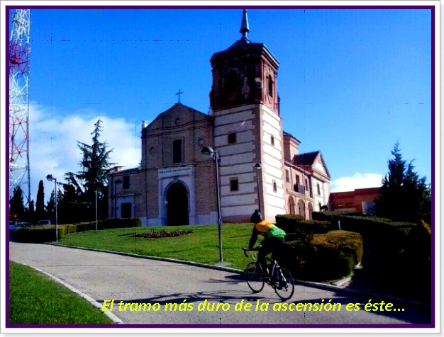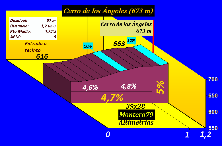 Iniciamos la misma en la entrada del recinto, con unos primeros casi llanos, para ir, poco a poco, endureciendo hasta encontrar pendientes al 7-8%, y así hasta el primer kilómetro, donde vuelve el llano. La última fase se desarrollará por una carretera de "dirección prohibida". Algo más de 100 metros que guardan sus rampas más duras (del 10%) que conducen a la iglesia ya mencionada.