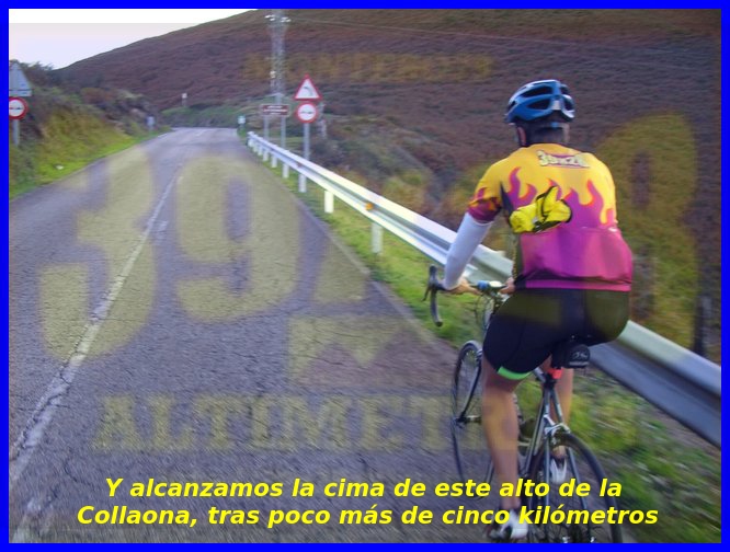Este es el reportaje de la subida a La Colladona, puerto muy conocido por la afición ciclista. Lo que aquí presento es la vertiente que sube desde Cabañaquinta, la cual es bastante dura, con un porcentaje medio superior al 7,5%. Lo más característico es la ausencia de descansos, siendo una ascensión muy continua (siempre entre 7-8%). La única pega que podríamos ponerle es que no es muy larga, de ahí que el coeficiente APM no sea excesivamente grande (como el de un puerto de 2ª). Comenzamos la ascensión en un cruce en la localidad de Cabañaquinta, tomando la carretera que se dirige hacia Pola de Laviana, y ya desde un principio las rampas son serias y se mantienen estables (en torno al 8%, con picos al 11-12%). La subida transcurre por una carretera con dos carriles delimitados aunque ausente de arcén. Coronamos este alto de la Collaona tras poco más de cinco kilómetros alcanzando una altitud de 850 metros.