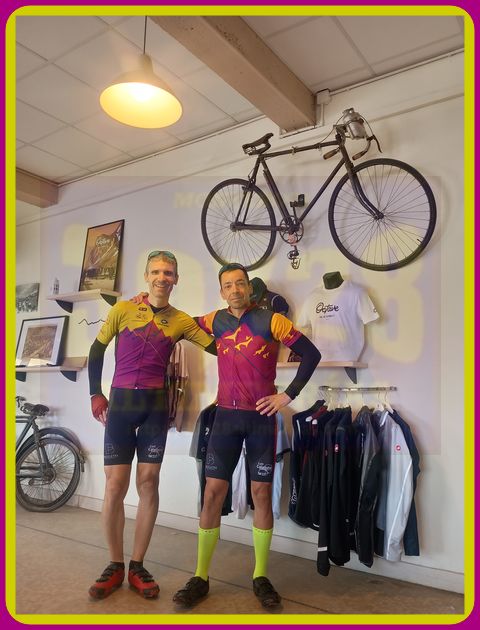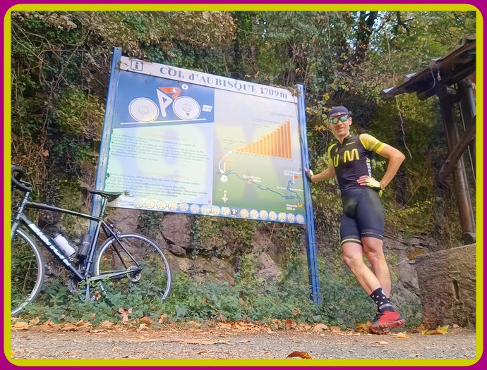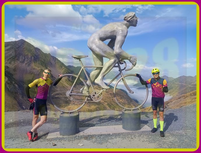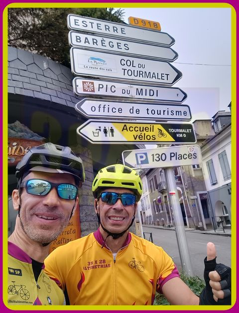 Con la equipación de gala (la de la web, como no podía ser de otra manera) posamos en este cartel, en Luz Saint Sauveur, donde nos indican el col du Tourmalet, nada más y nada menos.