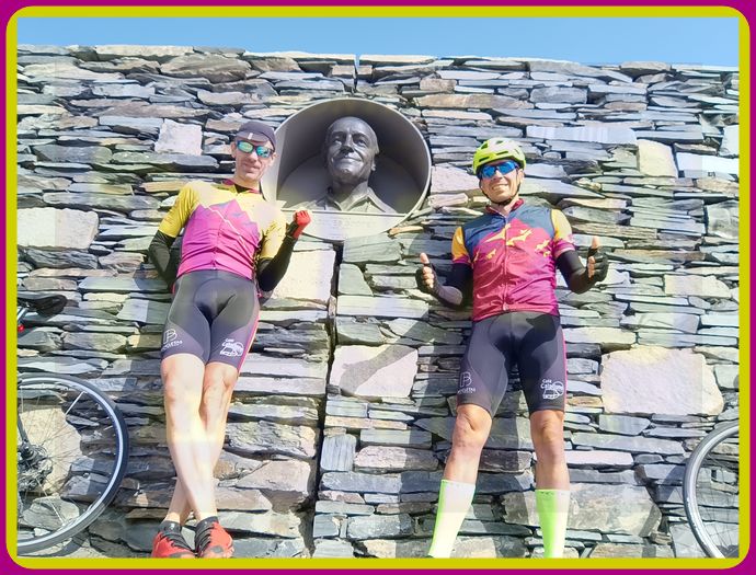 Posando, en el Tourmalet, con el busto de Jacques Godet, mítico director del Tour de Francia.