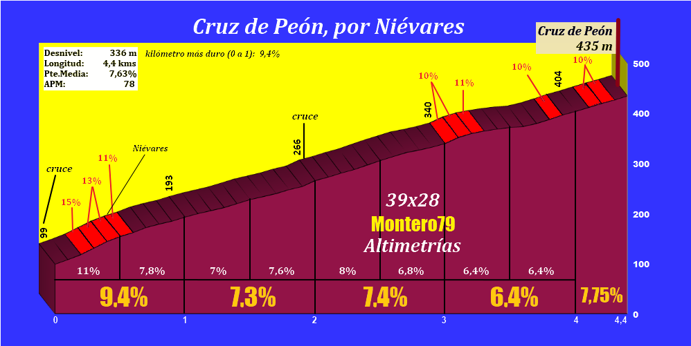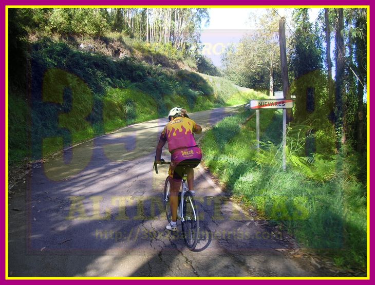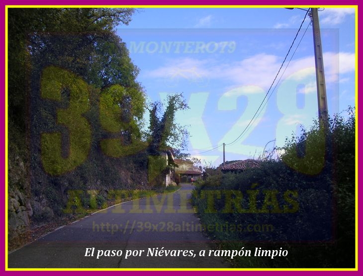 Sobre la Cruz de Peón ya habíamos hablado en cuanto a las vertientes principales: la proveniente de Peón y la que sube desde el alto del Pedroso (por Villaviciosa). Esta última puede tener un inicio distinto utilizando la carretera local VV-9, pasando por la localidad de Niévares, conformando una explosiva subida de poco más de cuatro kilómetros a una media del 7,6%. El inicio de la subida se ubica en el cruce que encontramos en la carretera local VV-10 (en el concejo asturiano de Villaviciosa) hacia Pión y El Pedroso. El arranque es realmente espectacular y muy duro, encontrándonos rampas ya del 14 y el 15% a la vez que la carretera serpentea en busca de la que une El Pedroso con la Cruz de Peón, la cual alcanzamos en el kilómetro dos. En ese cruce continuaremos, si es menester explicarlo (acuérdate de que la cabra tira el monte y por tanto tiraremos hacia arriba), a la izquierda para seguir subiendo algo más de dos kilómetros con pendientes en torno al 7-8% con zonas más despejadas en cuanto a vegetación.
