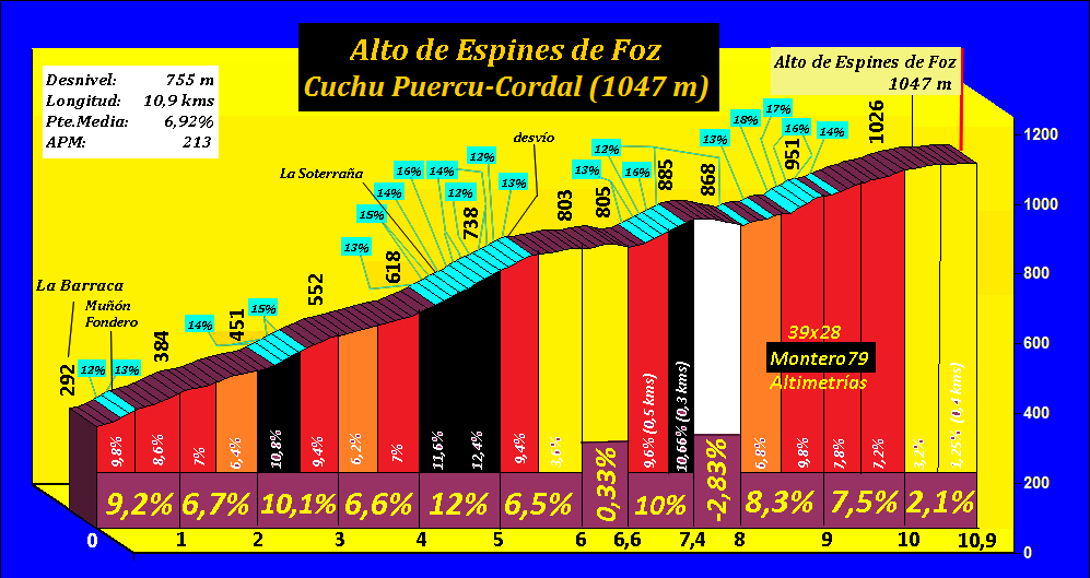 10,9 kilómetros al 6,9%, un desnivel de 755 metros y un coeficiente APM de 213 (se han analizado por separado las dos zonas duras posteriores al cruce al Cordal de ahí que este coeficiente sea aún mayor que si se hubiera realizado kilómetro a kilómetro de forma total).