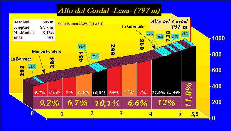 El Cordal arranca de La Barraca, en las proximidades de Pola de Lena, y lo hace de forma violenta, con rampas que se sitúan en el 13% en su primeros 500 metros, hasta alcanzar Muñón Fondero, donde habrá un leve descansillo. Posteriormente se suceden las pendientes duras (en torno al 9-10%) con tramos suaves (casi llanos) que perjudican la pendiente media. No será hasta bien sobrepasada la mitad del puerto, después de La Maerá (pueblo no indicado en el gráfico y que se sitúa mediada la subida) cuando la carretera se incline definitivamente de manera regular hasta el final. El último kilómetro y medio, que transcurre por las estribaciones de la antigua mina de mercurio de La Soterraña, tiene una media superior al 11%, rampas al 15 y al 16%, curvas de herradura y unas vistas increibles sobre todo el valle. Poco antes de coronar (a unos 100 metros de coronar), si aún queremos seguir ascendiendo, tenemos la posibilidad de tomar el desvío hacia el Cuchu Puercu (o Espines de Foz), toda una maravilla de la naturaleza.