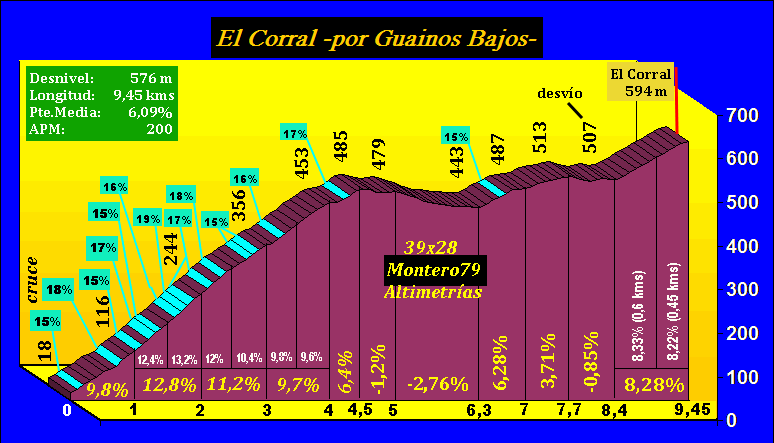 Comenzamos la ascensión cerca de la localidad de Guainos Bajos, en un desvío sin ningún cartel indicativo (ojo a este detalle) y ya las primeras rampas son de consideración (hasta un 15% en el kilómetro 0,15). Tendremos una breve tregua al atravesar el puente sobre la A-7, pero rápidamente volvemos al "infierno": entre el 0,7 y el 2,4, la media llega al 12,8%, con rampas puntuales al 16, al 17, al 18 y al 19%. Pero si infernales son las pendientes, también la meteorología puede jugar en contra al ser una carretera muy despejada, con lo que las altas temperaturas y el viente pueden hacer verdaderos estragos. Tras esos mencionados 4 kilómetros iniciales durísimos, encontramos un tramo muy suave, prácticamente llano, antes de afrontar un descenso leve que nos conduce a la parte final, y en donde la carretera se encajona en busca de la vertiente que viene de la localidad de La Parra (que sube desde el mismo pueblo de Guainos Bajos). Algo más de un kilómetro suave, otro tramo de toboganes que nos deja en el desvío a El Corral y su definitivo kilómetro a más del 8% de media. El firme empeora algo, aunque está aceptable para seguir la escalada. Coronamos El Corral (mejor dicho,  el lugar en donde finaliza el asfalto) tras 9,45 kilómetros a una media engañosa del 6,1%.
