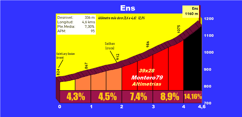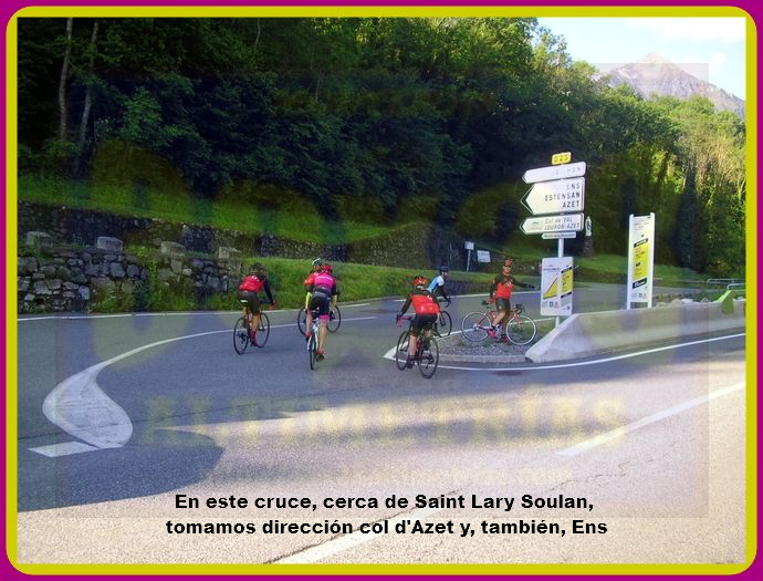 Comienza la ascensión (la medición) en un cruce cercano a Saint Lary en donde tomamos dirección Ens, además de col d'Azet. Las rampas va "in crescendo" a medida que nos aproximamos a Sailhan, a los dos kilómetros de subida, lugar en el que se encuentra el desvío a Ens, aunque también se puede continuar hasta el conocido puerto pirenaico que menciono arriba. Y a partir de ahí las rampas se van incrementando más y más por una carretera estrecha en donde, si te equivocas (como nosotros), puedes acabar pensando que esta vertiente del col d'Azet acabará algún día en la Vuelta vistos los rampones con los que nos recibe el pueblo de Ens, con un kilómetro final a más del 12% y rampas que alcanzan el 20%. Todo un descubrimiento...