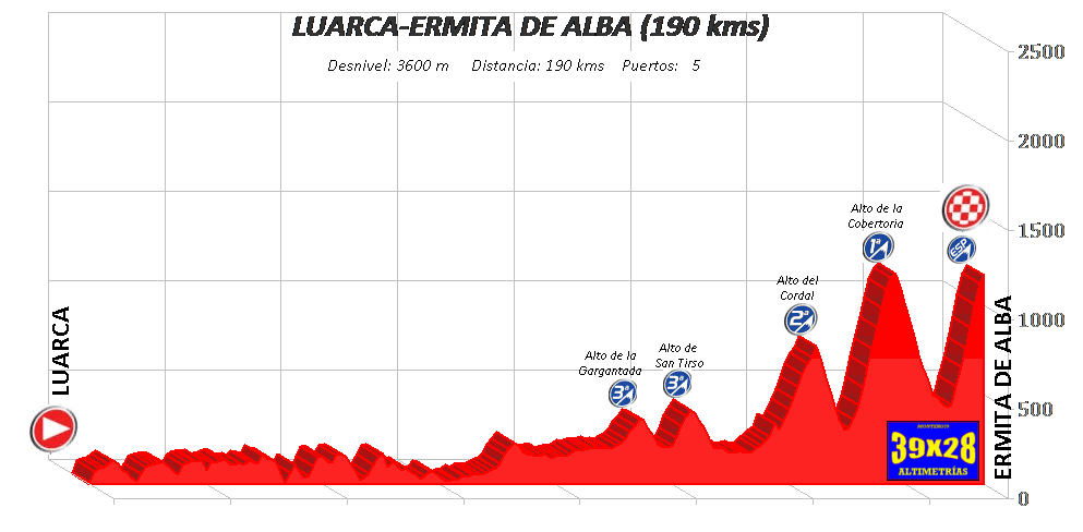 Saliendo de Luarca en dirección al largo alto de Bustellán, un primera de unos 15 kilómetros al 6%, para desembocar posteriormente en la Espina. Tomamos dirección valle de Somiedo para ascender posteriormente San Lorenzo, Cobertoria por Llanuces, descendiendo por Cortes para encarar Alba. Una etapa larga, de desgaste, con puertos bastante separados.