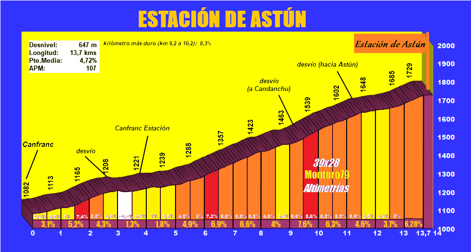 Situamos el inicio de esta ascensión en la localidad de Canfranc, si bien la carretera ya tendrá tendencia ascendente desde Jaca. A los tres kilómetros dejamos a un lado la carretera que va por el túnel, pero las rampas más duras no comenzarán hasta atravesar Canfranc Estación (recomendable la visita a la estación), con tramos ya en torno al 10% y un kilómetro intermedio superior al 8%. Una vez casi arriba de este puerto del Somport encontraremos el desvío a la Estación Invernal de Astún, prolongación de algo más de dos kilómetros cuyo asfalto (2019) no está en tan buenn estado como el de la carretera nacional del puerto. La tendencia es ascendente, sí, pero lo más duro no llegará hasta el último kilómetro, con rampas al 7-8%...