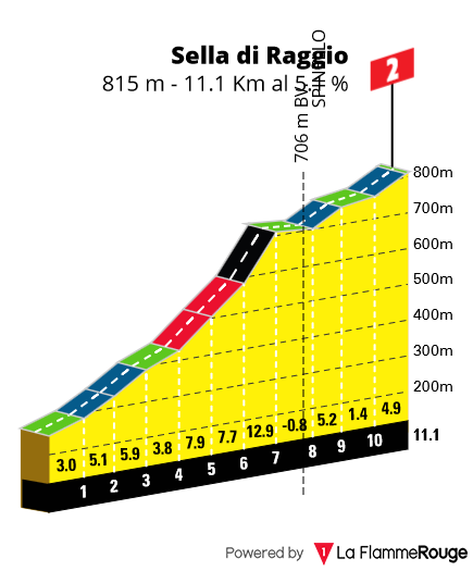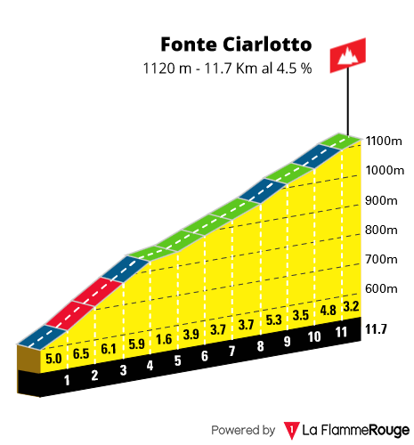 Dos grandes puertos (Forca di Gualdo, el primer "primera" de la carrera, sobre todo) en la sexta jornada y primer final en alto de manera genuina. La subida a San Giacomo cuenta con 15,6 kilómetros al 6% .