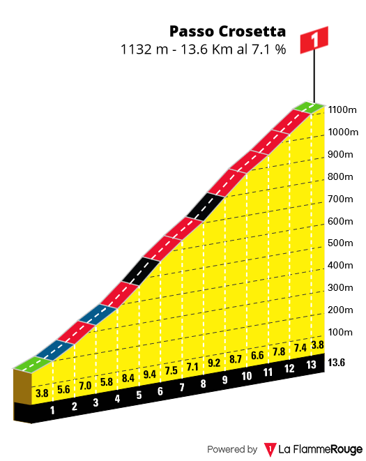 | Passo Crosetta | 966 m | 216 | 13,6 | 7,10 % | 2 | 3 | 9 | 0 |