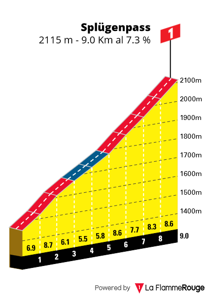 El larguísimo ascenso a San Bernardino marca la última jornada montañosa del Giro 2021, jornada en la que también se pasará el Splügenpass, antes de rematar en Alpe Motta, con 8,6 kilómetros al 7,5%.