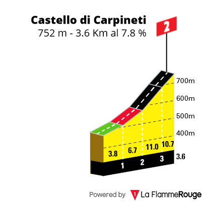 Tras Montalcino se programa uno de los mejores diseños de la edición, con la llegada Bagno di Romagna, etapa que cuenta con el duro Monte Morello (con su tramo central de 3 kilómetros a más del 10% de pendiente media), los largos Passo della Consuma y el Passo della Calla (ambos con más de 15 kilómetros y pendientes en torno al 5-6%) y para culminar el Passo del Carnaio (o, mejor dicho, Sella di Raggio), que dista unos 10 kilómetros de la meta.