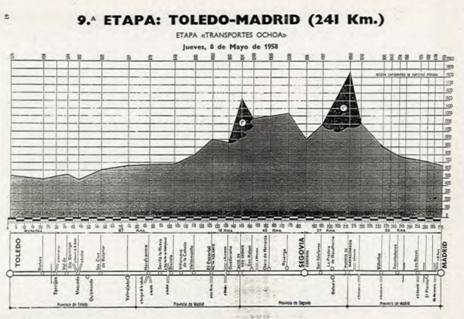 Aunque en 1958, en una vuelta de tuerca más, la etapa, de diseño similar, parte desde Toledo, con lo que se va, nada menos que, a los 241 kilómetros:
