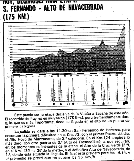 En 1978, cuando la organización de la Vuelta a España plantea, por vez primera, el paso por la cara madrileña, la etapa tiene que ser modificada, reduciéndose a 46 kilómetros, y suprimiéndose los puertos de Navacerrada y La Morcuera...
