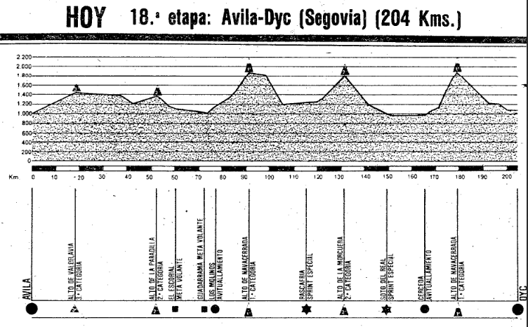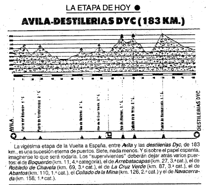 Un perfil muy similar se planteará en la Vuelta de 1988, con paso por Navacerrada previo a la llegada a las Destilerías DYC. Con opciones aún para 6 corredores (en menos de 2 minutos) la batalla en Navacerrada es de órdago, con el Kelly, favorito para la crono del día siguiente, defendiéndose con solvencia. Será Ángel Ocaña el corredor que pasará primero por Navacerrada, además de imponerse en la meta segoviana.