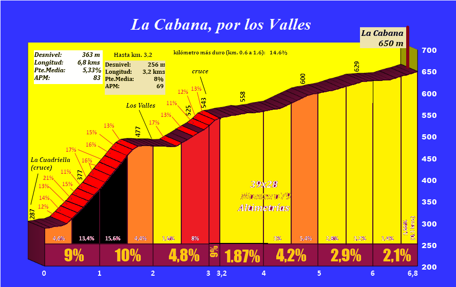 Esta es la altimetría de la ascensión a este alto que denomino de La Cabana (aunque se conoce más por Cueña o Vegalafonte, que quedan más abajo), porque es el pueblo más alto. Esta vertiente se inicia en la localidad mierense de La Cuadriella, en Turón, y es muy irregular. Se divide en tres partes diferenciadas, siendo la primera de ellas la más dura la segunda, irregular, aunque con un kilómetro duro que llega hasta el cruce del kilómetro 3,2 y, posteriormente, la tercera parte, ya hasta la Cabana. La ascensión es muy abrupta al principio con rampas que alcanzan el 21% (tras los primeros 200-300 metros, el siguiente kilómetro y medio tiene una media superior al 14%), entrando, en torno a los dos kilómetros, en una zona de falsos llanos, volviendo a inclinarse ya el último kilómetro antes del cruce con rampas que oscilan entre el 9-11%. Tras el cruce el panorama cambia por completo siendo ya muy floja hasta la cima.