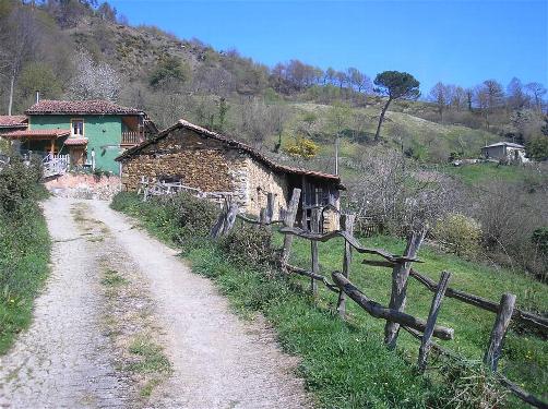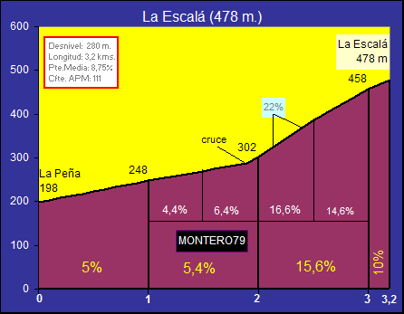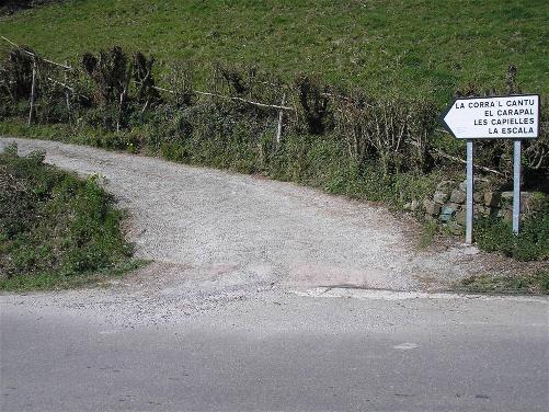 Esta es la altimetría de la ascensión al pueblo de La Escala, situado en el concejo de Mieres. La primera parte se corresponde con el alto de San Tirso (en su vertiente mierense) y tras 1,9 kilómetros tomamos un desvío (que se ve en la foto) hacia La Escalá (su nombre lo dice todo). A partir de aquí dejamos el buen asfalto por el que hemos transitado pasando al hormigón, y así hasta arriba. Las pendientes también se transforman, y cambiamos las suaves rampas de San Tirso por otras mucho más duras, con diversos muros superiores al 20%.