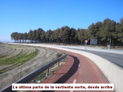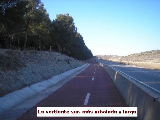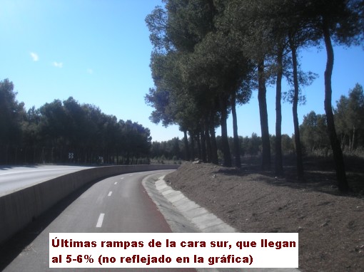 La vertiente sur, por su parte, arranca en el cruce que nos encontramos hacia el Parque Warner, una rampa al 5-6% que es todo un espejismo, pues vuelven, posteriormente, la tranquilidad y las pendientes más suaves. Esta cara tiene una longitud de algo más de 4 kilómetros.