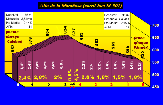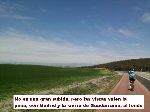 Sus números, como vereis a continuación, no reflejan especial dureza, pero el hecho de ser utilizada a menudo por cientos, miles, de cicloturistas cada día le dotan de cierto "prestigio". Ciclistas haciendo sus series, cicloturistas en busca de la tranquilidad y el suave clima del sur de Madrid, cicloturistas de pocas salidas, pelotones de clubs ciclistas,... todo un enjambre lo que nos podemos encontrar por las suaves rampas de este carril-bici, de este alto de La Marañosa, que tiene, eso sí, unas privilegiadas vistas de Madrid y la sierra de Guadarrama.
