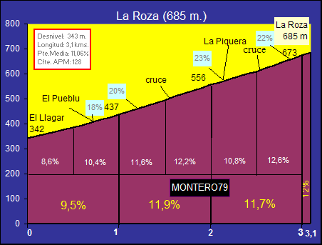 Este es el perfil altimétrico de la ascensión a La Roza, pequeño pueblo situado en el concejo de Aller. Se accede desde la antigua carretera que va de Moreda de Aller a Cabañaquinta. A la altura de la localidad de Llagar encontramos un desvío que nos indica esta localidad y, también, Arteos. La subida es coincidente con ésta hasta los 2,5 kilómetros en que la carretera se bifurca: una sube a Arteos y la otra continua hasta La Roza. Hay que decir que ésta es algo más dura alcanzando un desnivel medio superior al 11% y las rampas finales alcanzan el 22%.