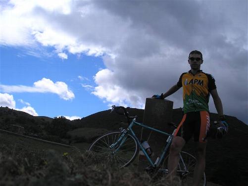 Lo cierto es que a medida que ha ido avanzando el año me he ido marcando ciertos retos dentro de mis posibilidades, porque yo no soy un ciclista profesional, yo no compito, yo, simplemente, tengo una desbordante afición por la bicicleta y por los puertos de montaña. De ahí que en la mayoría de las fotos que pongo casi siempre pose con la ropa de Altimetrias.net, “Los locos de las cumbres”. Ese es un equipo con el que me siento totalmente identificado. En muchos foros ya he puesto que competí, pero que era malo, malo de solemnidad, así que el capítulo de “correr” no va conmigo. Hago cicloturismo, cicloturismo de alta montaña porque es lo que me gusta. Tal vez a otros les apasione hacer 100 kilómetros llanos a 35 km/h. A mí, no. Me encantan los puertos, me encanta subir, a pesar de que tal vez mi constitución física no sea la de un “escalador”. Pero para eso existen dos soluciones: llevar unos desarrollos “adecuados” y echarle… eso exactamente…