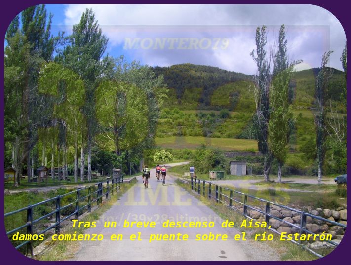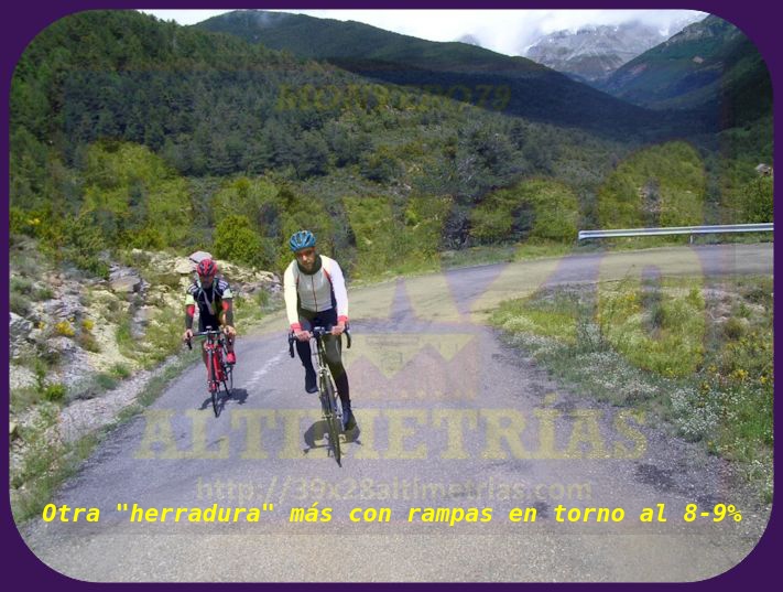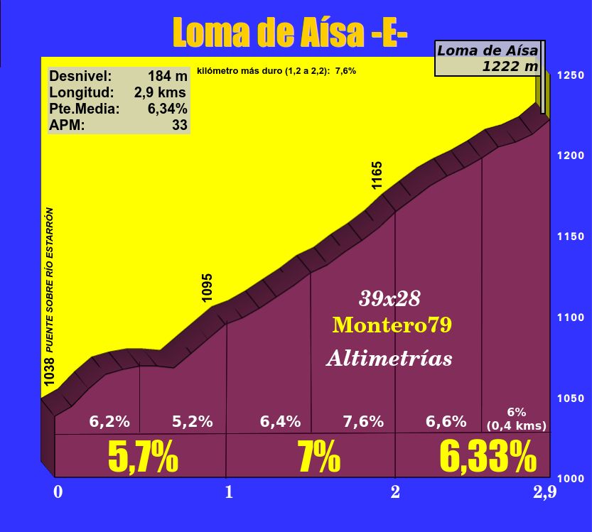 Pequeña ascensión situada al norte de la provincia de Huesca, en plenos Pirineos, lo que le dota, a pesar de su corta longitud, un aire de puerto de superior nivel. Iniciamos la subida en el puente sobre río Estarrón, tras descender de la localidad de Aísa, y ya desde un principio se alcanzan porcentajes, digamos, apañados, en torno al 7-8%, lo que será una constante. Antes del primer kilómetro tomamos un desvío a la izquierda y el trayecto se suaviza durante unos instantes, retomando poco después la dureza inicial y que se mantendrá ya hasta la cima por un paisaje francamente escénico y una carretera estrecha, de montaña, rugosa, características que, como señalaba más arriba, le confiere un aroma de puerto de más categoría que el que pueden indicar los números globales. Esta ascensión culmina a la altura del refugio de la Loma de Aísa, tras poco menos de tres kilómetros.