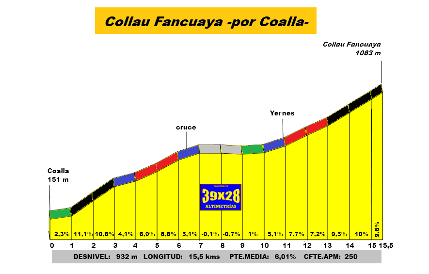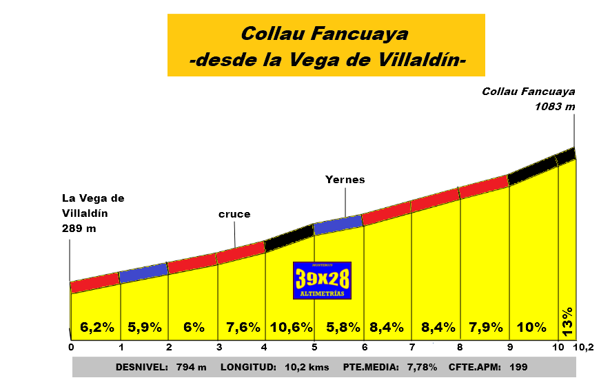 La vertiente de Coalla cuenta con dos kilómetros a más del 10% de pendiente media, aunque se suaviza mucho poco antes de alcanzar Yernes.