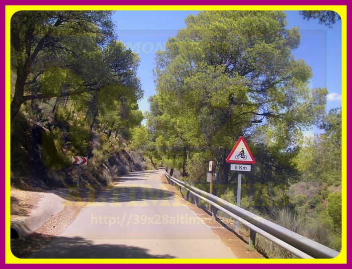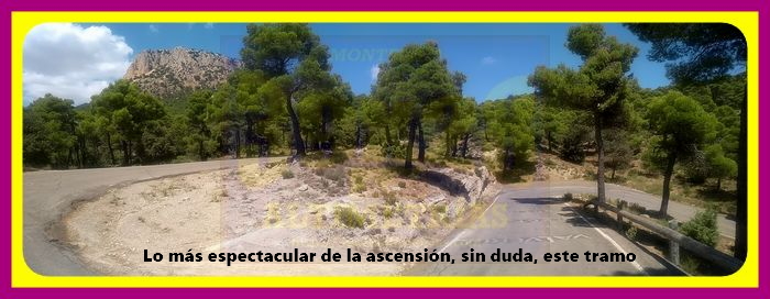 Pero vayamos por el principio. Arrancamos la subida a la salida de Totana, en la confluencia de las carreteras C-8 y RM-502, y los primeros kilómetros irán en progresión (de dureza) por una carretera más bien ancha. Y todo hasta pasado el sexto kilómetro, en donde a la altura de La Santa giramos a la derecha por una carretera mucho más estrecha, con algún que otro tobogán, alguna que otra rampa de consideración. Será una especie de atajo (sobre 2 kilómetros) que añade más interés a la subida (que también se puede afrontar por Aledo, claro). Seguidamente saldremos a la carretera principal, aunque ya con un asfalto más rugoso, un aspecto más de montaña, y en el kilómetro 10 tomaremos el definitivo desvío al collado Bermejo y el Morrón de Espuña. La subida se adentra en la sierra, primero con un largo tramo recto, bastante arbolado, con una pendiente muy sostenida en torno al 8-9%, lo cual se mantiene durante unos dos kilómetros: hasta el área recreativa de las Alquerías, paradisiaco lugar en el que vemos, frente a nosotros, la tremenda mole del Morrón de Espuña...si no nos la tapan los árboles, claro. La subida a partir de aquí se convierte en una sucesión de herraduras y la dureza se incrementa sobremanera. ¿Buscais puertos con múltiples herraduras? ¿Aún seguís embobados con Casielles y el famoso Lacets de Montvernier que mostró el Tour hace ya unos años? Pues aquí tenéis uno que va sobrado de curvas y curvas, que no tuve más remedio que retratar y retratar. Y si no encontrais el ángulo adecuado ahí está el mirador del collado Pilón para contemplar la grandeza de lo que va de ascensión. Herradura tras herradura nos servirá para alcanzar el puerto, el collado Bermejo, cercano a los 1200 metros de altitud, y de donde sale la carretera que sube al Morrón de Espuña (de Sierra Espuña). Carretera en buen estado, con rampas, digamos, "dubitativas" en principio, más despejado que el ascenso hasta el collado, y que nos deja ver la otra vertiente, la de Alhama, que se pierde en la inmensidad (más larga todavía), la dureza irá "in crescendo" y el "EVA 13" y el Morrón se irán acercando más y más, pero muy lentamente, porque las rampas más duras, ya de dos dígitos, se suceden en esta fase final de la subida. Al mismo tiempo algunos carteles comienzan a avisarnos de la entrada en la base militar y que "está prohibido el paso", lo que se concreta en una curva de herradura (una más), a más de 1510 metros de altitud, y a menos de un kilómetro de la verdadera cima.